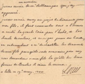 LOUIS XV (1710-1774) Roi de France et de Navarre. L.A.S. Lille, 19 mai 1744. 1 p. in-8. Beau cachet de cire rouge au dos du document. Le roi donne des indications sur la mode et les diamants portés par son fils [Louis de France] «Je vous envoie aussy un projet de diamants pour mon fils. Il faut commander tout a l'heure à rondé [Claude Rondé] la grande Croix, pour l'habit, et les boucles des souliers [...] en redemandant à M. de Charbellon les diamants de mon fils [...]».