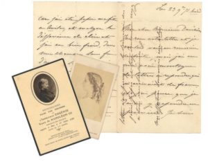 [NAPOLÉON III] EUGÉNIE de Montijo (1826-1920). Impératrice des Français, épouse de Napoléon III. L.A.S. «E» au comte Davillier. Madrid, 23 novembre 1871. 4 pp. bifeuillet in-8. Lettre d'exil au comte Davillier, ancien officier d'ordonnance et premier écuyer de Napoléon III, Ayant reçu une «montagne de lettres» qui lui arrivaient de France, l'Impératrice est extrêmement touchée de toutes ces preuves d'affection à une heure où l'on compte les amis. «On me dit dans chaque lettre que la santé de la colonie est excellente et que mon fils travaille bien. On dit même qu'il grandit beaucoup. L'E. m'a demandé le jour précis de mon arrivée. Je n'aime pas le lui dire parce que je ne veux pas que dans cette saison si froide, il aille à l'hôtel m'attendre [...]. Elle-même a eu très froid à Avila où elle a passé sa fête ; malgré la différence de climat, j'ai eu bien froid dans une chambre sans feu [...]. Je crois donc qu'il serait déraisonnable d'agir autrement. Si elle ne s'appesantit pas davantage sur le sujet de sa lettre, c'est parce que le souvenir des jours passés est trop douloureux [...]». On joint un portrait de l'Impératrice d'après Winterhalter et une carte pieuse à son effigie.