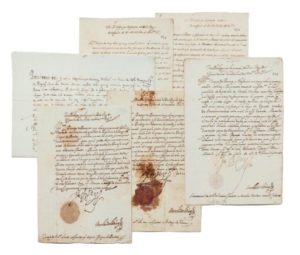 PHILIPPE II (1527-1598) Roi d'Espagne, de Sicile et du Portugal. RECTIFICATIF AU CATALOGUE : 7 LETTRES PORTANT LA SIGNATURE AUTOGRAPHE DE PHILIPPE II Très rare et important ensemble de 7 L.S. avec cachets aux armes sous papiers. 6 pp. Divers formats. L.S. Adressée au cardinal Antoine Perrenot de Granvelle, Aranjuez, le 20 mai 1571. 1 p. in-4. À propos des prérogatives et prééminences que demande sa sœur la duchesse Marguerite de Parme. On joint un grand in-folio signé ; Naples, le 24 avril 1574, deux L.S à Alexandre Farnèse. Madrid, décembre 1571, Février 1585. 2 pp. in-folio. La première annonce la naissance de son fils Ferdinand d'Autriche. La seconde évoque la mort de jeunes soldats en Italie, une page grand in-folio signée. Lisbonne, 24 mars 1586. Trace de sceau. L.S. «Yo el Rey», Madrid, le 5 avril 1588 évoquant un différend entre le duc de Guise et le marquis de Habré.
