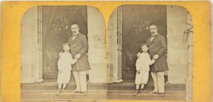 [PRINCE IMPÉRIAL]. Émouvant photographie stéréoscopique de l'Empereur enlaçant son fils le jeune Prince Impérial, posant sur les marches, devant une porte vitrée du palais de Fontainebleau. Photographie prise par le capitaine Grillet, des pompiers de Paris en 1864.