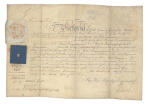 VICTORIA (1819-1901) Reine du Royaume Uni. P.S. «Victoria» dans l'angle supérieur gauche, Windsor, 13 décembre 1039. 1 p. gd in-folio oblong, sur parchemin. Cachet de cire rouge sous papier, Timbre bleu. Nomination de George Webb, comme «Cornet» effective à partir du 6 septembre 1839. On joint un laissez-passer en partie imprimée. La description manuscrite du navire est en grande partie effacée, les signatures des commissaires et Amiraux, sont bien visibles. Belles gravures.