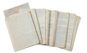 AYMÉ Marcel (1902-1967) La Vouivre. Conte fantastique issu d'une vieille légende comtoise qui dévoile l'influence du paganisme face au christianisme dans le monde paysan. La Vouivre a été portée à l'écran par Georges Wilson avec Lambert Wilson et Suzanne Flon en 1988. Manuscrit autographe, (s.l.n.d. 1943), 67 pp. 21x27cm, quelques ratures et corrections. Manque la première page. Le roman est paru en préoriginale dans La gerbe du 22 juillet au 9 décembre 1943, et chez Gallimard le 27 novembre 1943. La plupart des corrections, des suppressions de passages sont signalées dans la Pléiade p.1870. Conte faisant apparaître le personnage fantastique de la vouivre, issu de la tradition celtique. Elle porte un diadème orné d'un magnifique rubis, quiconque veut s'en emparer succombe aux morsures de centaines de serpents. Elle apparaît sous la forme d'une séduisante jeune fille au héros : Arsène Muselier, paysan prudent qui va tisser avec elle des liens d'amitié. Il est amoureux de sa voisine, mais les deux familles sont en conflit, il est ému par Belette la jeune servante qui est amoureuse de lui. Le curé veut essayer de regagner ses ouailles en organisant une procession contre la vouivre, mais le maire radical et laïc est dans un grand embarras. Belette, apprenant les fiançailles d'Arsène décide de se suicider en volant le rubis, Arsène se précipite pour la sauver des serpents mais ils meurent tous les deux. La vouivre ne connaîtra pas le mystère de la mort. Provenance : au propriétaire actuel par descendance de l'auteur. Bibliographie : Marcel Aymé, Œuvres romanesques complètes (Ed. Michel Lécureur), t3, Bibliothèque de la Pléiade n°477. Document bénéficiant d'un CBC