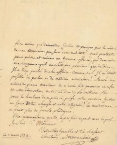 BEAUMARCHAIS Pierre-Augustin Caron de (1732-1799). L.A.S. [à Monsieur de Sartine (s.l. [Fort-l'Evêque]) le 11 mars 1773. 3 pp. in-4. Belle lettre sur son affaire avec le duc de Chaulnes. En effet le 11 février 1773, Beaumarchais et le duc de Chaulnes eurent une altercation suivie de pugilat, au sujet d'une actrice Melle Mesnard. Beaumarchais fut incarcéré au fort l'évêque, c'est là qu'il écrivit cette Lettre «[...] il est bien prouvé pour moi maintenant, qu'on veut que je perde mon procès, s'il est perdable, ou seulement douteux. Mais je vous avoue que je ne m'attendais pas à l'observation derisoire de Mr le Duc de la vrillière de faire solliciter mon affaire par mon procureur, lui qui sait aussi bien que moi que cela mesme est deffendu aux procureurs. Ah ! grands Dieux ! ne peut on perdre un inocent sans luy rire au nez ? Ainsi Monsieur j'ai été grievement insulté, et l'on m'a denié justice, parce que mon adversaire est de qualité. J'ai été mis en prison et l'on my retient, parce que j'ai été insulté par un homme de qualité. L'on va jusqu'à trouver mauvais que je fasse revenir le public des fausses impressions qu'il a recues [...] pouvais-je faire moins que demander justice et prouver par la conduite de mon adversaire que je n'avais nul tort ? [...] Receves mes actions de grâces monsieur de m'avoir fait parvenir ce refus et cette observation de Mr le duc de la Vrilliere ; et pour le bonheur de ce païs ci, puisse votre pouvoir egaller un jour votre sagesse et votre intégrité ! les malheureux ne feront plus de pareils plaidoyers [...]». Lettre publiée dans Beaumarchais correspondance, Tome II (Février 1773-Décembre 1776), Paris, A.-G. Nizet, 1969. p 22 et 23, n°240.