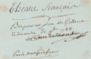 BEAUMARCHAIS Pierre-Augustin Caron de (1732-1799). B.S. (s.l.), 30 novembre 1788. 1 p. in-12. «Théâtre Français Bon pour une place à la Galerie Ce dimanche 30 novembre 1788 [...] Pour le Mariage de Figaro» Le Mariage de Figaro, comédie en cinq actes, rédigée en 1778, fut présentée au public le 27 avril 1784 après 7 ans de censure. Document bénéficiant d'un CBC