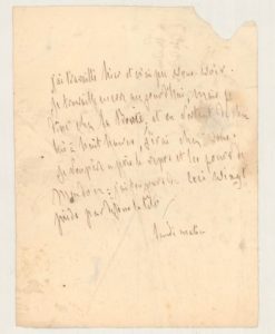 CHATEAUBRIAND François-René de (1768-1848) Écrivain, Pair de France, diplomate (ambassadeur à Berlin en 1821, Londres en 1822, Rome en 1828-29), ministre des Affaires étrangère (1823-1824). L.A. à la Duchesse de Duras. (s.l.n.d. «Samedi matin»). 1 pp. in-4, adresse au verso, légèrement froissée avec taches claires. Lettre à son amie Claire de Duras, évoquant Meudon (ou la Vallée-aux-Loups) «J'ai travaillé hier et n'ai pu vous voir. Je travaille encore aujourd'hui ; mais je dîne chez La Borie ; et en sortant de chez lui à huit heures, j'irai chez vous. Je soupire après le repos et les jours de Meudon : j'ai toujours de ceci vingt pieds par-dessus la tête [...]».
