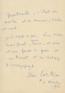 COCTEAU Jean (1889-1963). Manuscrit autographe signé (s.l.) 5 novembre 1955. 1 p. in-8. Beau manuscrit en hommage à Maurice Utrillo rédigé au moment de son décès "Montmartre, c'était un moulin et le meunier Utrillo est mort. Qu'il repose en paix. Lucien Valou, Max Jacob, Francis Carco, et nous et une foule de gens et un Pierrot et un chat noir l'accompagnent.»