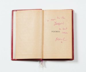 COCTEAU Jean (1889-1963). Poèmes, NRF Gallimard, premier plat conservé, Basane rouge, dos à 4 nerfs dorés, insolé, coiffes et plats frottés. 159 pp. Exemplaire portant un bel envoi signé «Jean C» au stylo rouge «A mon très cher Jaujard de tout cœur». Jacques JAUJARD (1895-1967) directeur des Musées nationaux et de l'Ecole du Louvre en 1940. Il œuvra à la sauvegarde des collections d'art publiques et privées et encouragea l'action de Rose Valland.