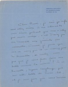 COLETTE Sidonie Gabrielle (1873-1954). L.A.S. à «Cher Henri» (s.l.n.d.) 2 pp. in-folio sur papier bleu, en-tête gravé à son adresse. Elle est soulagée que son ami aille mieux et lui propose «Comme je pense que vous ne cessez pas et ne cesserez pas de travailler, ne voulez-vous pas que je vous fasse faire une table comme la mienne ? Je ne travaille, depuis longtemps, que sur cette table de divan-lit [...] Dites un mot, faites un clin d'œil, et je vous bâtis une table comme la mienne !»