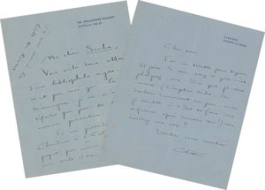 COLETTE Sidonie-Gabrielle Colette dite (1873-1954). Femme de lettres. 2 L.A.S. «Colette de Jouvenel» à sa chère Sacha et «Colette». Paris, s.d. (circa 1920). 3 pp. in-4 sur papier en-tête de son adresse 69 Boulevard Suchet pour la première, sur papier entête du Claridge pour la seconde. Elle répond à son amie Sacha qui lui demande des exemplaires sur grand-papier de ses derniers romans «Vous voilà donc atteinte d'une bibliophilie aigüe. Ce n'est pas moi qui la décourageais [...]. Je ne possède aucune «Claudine à l'Ecole» sur grand papier ; pas même, je crois, une seule édition originale des «Claudine» [...]. «Le Blé en herbe» va bientôt paraître et je vous l'enverrai, mais je n'ai retenu, hélas, que deux grands papiers, un pour Sido, un pour moi. Le reste appartient à des amateurs [...].» ; Souffrante, Colette prie un ami de venir la voir dès qu'elle ira mieux ; «J'ai un terrible zona depuis 26 jours. Si vous savez ce que c'est, plaignez-moi [...]. Dès que je serai mieux, [...] vous viendrez me voir ? [...].»