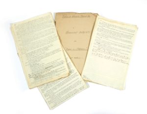 DUMAS Alexandre (1802-1870). Copie carbone d'un manuscrit intitulé Voyage en Belgique (indication sur les chemises), avec des corrections autographes d'Alexandre Dumas. (s.l.n.d.[1838-1839]) 246 pp. et 24 demi-pages, in-plano (27,2 x 42,5 cm) sur papier vergé filigrané (coquille Saint-Jacques et des initiales «LA ✠ F»). Manuscrit incomplet, si l'on suit la numérotation des pages, il manque 35 pages réparties sur les volumes II, III et IV. Cet important ensemble est très intéressant, car il présente une version avec de fortes variations, de nombreuses annotations et corrections, de plusieurs œuvres d'Alexandre Dumas. Il comprend plusieurs publications : 16 chapitres (sur 36) de son ouvrage Excursion sur les bords du Rhin : impressions de voyage, publié pour la première fois en 1855. Certains passages furent publiés précédemment, dans La Revue de Paris en 1838, sous forme de lettres (5 lettres) «Lettre à Eugène Delacroix» etc. Puis quelques fragments encore en 1840 Dans Le Siècle des 13, 23 août et 13 septembre. Une rare version primitive des Aventures de Lyderic (complète), des Chronique du Roi Pépin (complète) et des Chronique de Charlemagne (incomplète manque le dernier chapitre). Les Chroniques furent publiées dans Le Siècle en juillet et août 1841, puis en volume en 1842, augmentées des Aventures de Lyderic. Cette copie carbone contient des annotations de deux types : certaines proviennent du premier jet (copie carbone), les secondes ont été réalisées postérieurement et sont à l'encre (encre métallo-gallique). Le procédé reprographique pourrait être la «presse à copier portative» qui fit son apparition en mars 1838 (date de la publicité dans le Journal des débats du 24 mars 1838) pour celle réalisée par George Leuenberg, vendu en France chez J. Panier, négociant, rue Vieille-du-Temple à Paris. Cette presse innovante avait deux avantages, elle était de format réduit («peut se porter roulée dans la poche» *) et d'un coût modique, 10 Fr. Nous émettons cette hypothèse (qui reste à démontrer) car le dépôt de carbone sur le papier se situe en surface, le papier n'est pas foulé par un trait de crayon ou autre outil d'écriture. En ce qui concerne les variations, les titres des chapitres changent, les Chronique du Roi Pépin et Charlemagne ne forment qu'un seul et même ensemble intitulé Chronique de Charlemagne au lieu de deux publications. A noter des variations intéressantes pour la Lettre à Eugène Delacroix, puisque se superposent de façon lisible la première version du texte et la version qui servit à la publication dans La Revue de Paris.