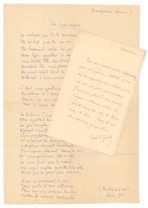 GIDE André (1869-1951). Ecrivain. L.A.S. (à Mireille Havet). Dimanche (circa 1915). 1 p. bifeuillet petit in-12. Encouragement littéraire de Gide qui a reçu des poèmes de la jeune Mireille Havet ; adulée par les salons mondains de la Capitale, appelée la «petite poyétesse» ou encore la «gonzessse de premier ordre» par Apollinaire, elle recevra les soutiens de Cocteau, Colette, Paul Fort. «Tous mes remerciements, Mademoiselle, pour vos poèmes. Désolé, si vous me les apportiez vous-même, qu'on ne vous ait point prié d'entrer. Gide aurait eu plaisir à la revoir, n'ayant nullement oublié nos fortuites rencontres chez les Beaumont, les Sert [...]». On joint la copie originale d'un poème de Mireille Havet, intitulé «Les Lys rouges» et dédié à Lilie de La Nux, juin 1915. (28 vers sur 1 pp. in-folio). Je Voudrais que tu te souviennes / De ces lys que tu ne vis pas. / Ils dressaient contre les persiennes / Leurs tiges pareilles à des bras [...]. C'était une apothéose / De couleurs et d'harmonie / Que ces Lys au cœur de rose / Sur le mur de pierre unie [...].