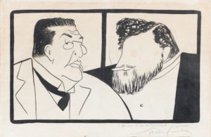 GUITRY Sacha (1885- 1957). Dessin original à l'encre de chine, dédicacé au crayon en bas à droite «Bien amicalement / Sacha Guitry». 31 x 48 cm Il s'agit d'un double portrait très amusant du patron de presse Alfred EDWARDS (1856-1914), directeur du Matin puis du soir, ainsi que du baron Henri de Rothschild (1872-1947) médecin, auteur dramatique et entrepreneur qui fit construire le théâtre Pigalle. Ce dessin a figuré sous le n°32 à l'exposition de 1911 chez Bernheim jeune.