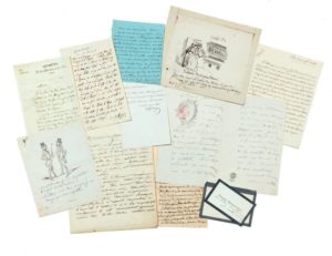 LITTÉRATURE ET DIVERS. Ensemble d'environ 100 documents, principalement des L.A.S. (deux documents de secrétaires et un fac-similé), quelques photographies. Environ 110 pp. quelques demi-pages. Format divers. Cet ensemble regroupe des lettres rédigées durant le XIXe siècle, la plus ancienne est datée de 1810, la plus récente de 1899, avec entre autres Alfred Arago ; Arrighi ; Sarah Bernhardt ; W. Bürgen ; J. A. Bucheva; La soprano Marie Battu et un dessin de Bertall la représentant ; la mémorialiste Victorine de Chastenay ; 2 dessins de Cham ; Champfleury ; Alphonse Daudet ; Eugène Destains (directeur des Archives de la Littérature et des Arts ) ; Alexandre Dumas fils ; R. de Duras ; Duc de Damas ; Prosper Enfantin ; Alphonse Esquiros ; François Guizot ; Jules Hetzel ; Louis Hersent ; Alexander von Humboldt ; Jules Janin ; L'orientaliste Jules Mohl ; Urbain Le Verrier ; Alphonse de Lamartine ; le dramaturge Lambert-Thiboust ; le dramaturge Charles Sanguin, marquis de Livry ; le philosophe, mathématicien et précurseur de la psychologie Pierre-François Maine de Biran Amédée Pichot ; Eugène Pelletan ; La comtesse de Montalivet ; Pierre Puvis de Chavannes ;Jules Michelet ; le linguiste Sylvestre de Sacy ; Victorien Sardou ; Albertine de Staël-Broglie ; Louis Ulbach ; Madame de Swetchine ; Photographie de Loïs Fuller et sa troupe (avec cachet du photographe) ; Enveloppe avec beau cachet de cire de la Duchesse de Vendôme annotation de Louise Filliaux-Tiger, dans cette enveloppe : 5 photographies-carte postale ; Louis Viardot ; la compositrice et pianiste Louise Filliaux-Tiger et bien d'autres.