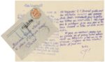 LOUYS Pierre (1870-1925). Ecrivain. L.A.S. «P.L.» à Louis Loviot. Vendredi soir (mai 1913). 2 ff. sur bifeuillet in-8 ; joint son enveloppe. Belle lettre écrite sur le ton sarcastique, de Louÿs à son ami Loviot (1885-1918). «Si vous L'AVIEZ 1° je vous aurais téléphoné ce soir avant le dîner tous les détails de l'élection du dictateur. - Kss ! Kss ! - 2° vous sauriez que depuis dimanche j'ai rendu mon âme à Dieu avec 40°4 de fièvre, je suis descendu chez les morts et je suis ressucité le troisième jour. - sic - Mais tant que vous ne L'AUREZ pas vous n'apprendrez mon décès que par la Nécrologie du Journal des Débats qui par une vieille tradition est en retard de huit jours sur les enterrements [...]». Louÿs lui demande s'il aura le temps de lui faire des recherches à l'Arsenal «[...] Quels sont les véritables numéros des dossiers Arch. Bast. intéressants pour la police des Lettres au XVIIIe siècle ? Car, n'ayant pas le catalogue je ne sais pas si la série Censure et Pilon est seule de son espèce [...]». Il l'invite à passer rue de Grenelle, etc. C'est en 1913 que Pierre Louÿs, Louis Loviot, bibliothécaire à la Bibliothèque de l'Arsenal, et Paul Chaponnière, fondèrent la Revue des Livres anciens ; de cette revue bibliophile tirée à 500 exemplaires, 8 numéros paraitront jusqu'en 1917.