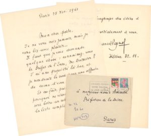 PAGNOL Marcel (1895-1974). L.A.S. à Louis Amade, Paris, 25 novembre 1961. 1 p. ½ in-4. Enveloppe jointe. Pagnol lui demande un service «pour une affaire de cours d'eau» et ajoute «[...] au fait, puisque je suis là, pourquoi ne viendriez-vous pas un soir boire un whisky chez moi, avec la liste complète de vos œuvres ? J'ai depuis longtemps des idées à votre sujet... [...]»