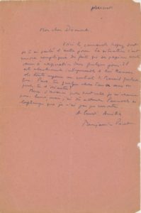 PÉRET Benjamin (1899-1959). L.A.S. à son «cher Dumont» (s.l.n.d. «Mercredi»). 1 p. in-8. Papier pelure saumon. Il informe son correspondant «Voici le camarade Lopez dont je t'ai parlé l'autre jour. Sa situation s'est encore compliquée du fait que ses papiers vont venir à expiration dans quelques jours. Il est absolument indispensable de lui trouver de toute urgence un contrat de travail quelconque. Peux-tu quelque chose dans ce sens ou peux-tu l'orienter [...]» Document bénéficiant d'un CBC