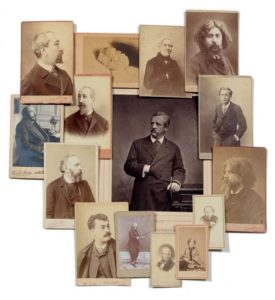PHOTOGRAPHIES D'ÉCRIVAINS. Ensemble de 28 photographies d'époque, 2 tirages plus récents (dont un retirage) d'illustres écrivains de notre temps. Clichés par Nadar, Ch. Reutlinger, Paul Manuel, J.Gurney & son (Brodway N.Y.), London Stereoscopic Company etc. AUGIER Emile (1) format carte de visite; BARRÈS Maurice à Sainte Odile (25,5 x 18,8 cm) ; COPPÉE François (2)par Nadar (10,8 x16,7) cm et par Appleton format carte de visite ; DAUDET Alphonse (2) par Nadar (10,8 x16,7 cm) ; DICKENS Charles (2) format carte de visite par J. Gurney & son et the London stereoscopic and photographic company ; DOUCET (Camille) (1) format carte de visite, DUMAS père Alexandre (1) par Reutlinger format carte de visite ; FEUILLET Gustave (1) par Reutlinger format carte de visite ; FÉVAL (Paul) (1) par Franck format carte de visite ; FRANCE Anatole (3) par Nadar, Reutlinger et photographie carte postale (10,8 x 14,4 cm) ; GAUTIER Théophile (1) 7,8 x 12,5 cm ; HUGO Victor (4) par Bonnat sur son lit de mort (14,4 x 10,8 cm) et format carte de visite par Delplanque, deux grands formats dont un retirage (17,8 x 23,8 cm) ; MICHELET Jules (1) par Nadar (10,8 x 14,4 cm) ; MURGER Henry (1) format carte de visite ; NOIR Victor (1) par Appert, format carte de visite ; PROUDHON Pierre-Joseph (2) par Nadar et Reutlinger, format carte de visite (6,5x 10,7 cm) ; ROLLAND Romain (1) par R Autin (10,8 x 14,4 cm) ; ROSNY Aimé (1) par Dard Frères (10,8 x 14,4 cm) ; ROSNY Jeune (1) par Henri Manuel (10,8 x 14,4 cm) ; SAND George (1) format carte de visite ; SULLY-PRUDHOMME René Armand François Prudhomme dit (1 ) par Petit (10,8 x 14,4 cm).