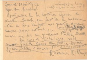 ROLLAND Romain (1866-1944). C.A.S. adressée à monsieur Henri Barbusse, samedi 20 août 1927. 1 p. in-12. Adresse. Romain Rolland évoque son sentiment envers le Sénateur républicain William Edgar Borah à propos de l'affaire Sacco-Vanzetti. «Un ami de l'Amérique vous somme de gracier sacco-vanzetti même si coupables, l'humanité l'exigeait".