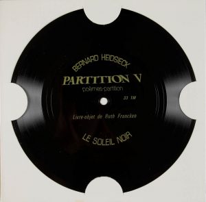 HEIDSIECK Bernard.Partition V. Poèmes partition. Paris, Le Soleil Noir, 1973. In-8 carré, br. sous emboîtage noir. Livre-objet contenant 2 sculptures de Ruth FRANCKEN, profils de téléphone en alu anodisé et acier chromé. Édition originale....