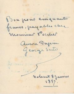 SAND George (1804-1876). Femme de lettres. B.A.S. «Aurore Dupin - George Sand». Nohant, 8 janvier 1857. 1 p. petit in-12. Quittance de Sand qui signe de ses deux noms : «Bon pour cinquante francs, payables chez Monsieur Porcher. Aurore Dupin, George Sand.».