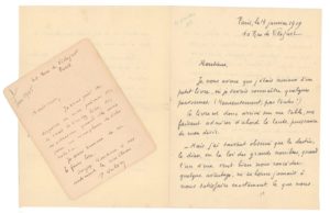 VALÉRY Paul (1871-1945). 2 L.A.S. Paris, juin 1905 et 14 janvier 1919. 4 pp. in-8 et petit in-12 sur papier fort aux tranches dorées. En juin 1905, il demande «je vous prie de disposer de mon poème et, si vous le voulez bien, de m'adresser quand elle aura paru, un exemplaire de votre mélodie. Je serai heureux de me la faire lire. [...]» ; le 14 janvier, Il exulte «Je vous avoue que j'étais curieux d'un petit livre, où je savais connaître quelques personnes (Heureusement, pas toutes !). [...] C'est ainsi que le petit livre, non content de me parvenir, m'est parvenu sous une dédicace si gracieuse. Ce n'est pas tout encore : Si ma curiosité fut satisfaite, mon goût de l'élégance du langage, de sa pureté bien conduite et de ses justes ornements, le fut à un rare degré [...]».