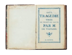 [VOLTAIRE François-Marie Arouet de (1694-1778)]. SAÜL «Manuscrit philosophique clandestin». Manuscrit (s.l.n.d. [Paris, circa 1763]). 68 pp. in-8, sur feuillets ornés aux rectos et aux versos d'encadrement floraux gravés sur bois et tirés à l'encre bleue, tranches rouges, le tout dans une reliure contemporaine en veau marbré, dos à 5 nerfs et gardes de papier marbré, renforcé aux charnières. Étiquette du cabinet de M. Janvier de Flainville, avocat au parlement, & au bailliage présidial de Chartres, sur une garde en papier marbré. L'ouvrage est référencé : «Belles-Lettres - Article 38 - Numéro 463 - Époques diverses». Inscription manuscrite sur la garde blanche : «Ce manuscris m'a été donné le 11 septembre 1773 par Made. Valler - Relié le 6 septembre 1777...... 15». Seule et unique tragédie biblique rédigée par Voltaire [1], Saül a une place à part dans le corpus de cet auteur. Écrite en prose et ne respectant aucun des canons du genre comme la bienséance ou l'unité de lieu et d'action, cette courte pièce se déroule en cinq actes. Elle prend place dans différents espaces (Caglala, la colline d'Achila, Siceleg, Hébron et Jérusalem) et condense près de 80 ans d'histoire biblique, elle couvre ainsi une période allant de la victoire de Saül sur le peuple des Amalécites (en 1079 av. J.-C.) jusqu'à la mort de David (en 1015 av. J.-C.) [2]. Véritable pamphlet anticlérical dénonçant les folies du fanatisme religieux, Saül mélange les genres et comporte de nombreux aspects burlesques. Selon Clément Van Hamme, «la pièce est d'abord une parodie de la Bible qui veut mettre en évidence les invraisemblances et les violences racontées par le texte sacré, en prétendant ne faire qu'en respecter la lettre» [3]. Cette version de Saül appartient à un genre bien particulier, celui des «manuscrits philosophiques clandestins». Selon Alain Mothu, ils désignent des «écrits à caractère didactique et philosophique au sens large, dans leur intention rationaliste commune de dissoudre [...] des idées reçues qui concernent [...] les religions «factices» ou révélées [...]» [4]. Notre exemplaire est d'une grande rareté puisqu'il n'a été répertorié pour l'instant que quatre manuscrits clandestins de cette pièce [5]. Une étude de sa matérialité laisse supposer de la volonté de produire plusieurs exemplaires de ce manuscrit notamment par la présence d'éléments typographiques et ornementaux apposés à l'aide de pochoirs ou imprimés avec une matrice en bois. Le recours à de tels procédés ne laisse aucun doute sur le dessein de réaliser ainsi plusieurs exemplaires alors qu'une telle intentionnalité est absente des deux manuscrits de Saül conservés à la bibliothèque Mazarine [6]. Il est fort probable que notre ouvrage provienne d'un atelier spécialisé dans ce genre de production clandestine dont Ira Owen Wade a documenté l'existence à Paris grâce aux archives de la Bastille [7]. Cet état de fait amène à supposer que notre ouvrage fut peut-être l'un des manuscrits publiés de manière concomitante à la version imprimée. Saül est une pièce rédigée vers 1761 et publiée en 1763, sous le faux millésime de l'année 1755. Elle a sans doute fait l'objet d'une représentation à Berlin sous Frédéric II d'après un témoignage de Bernardin de Saint-Pierre [8]. Le caractère sulfureux de ce texte rend particulièrement complexe la connaissance de sa diffusion manuscrite et imprimée. Comme le souligne Christophe Paillard, «Voltaire n'a eu de cesse de démentir la paternité de Saül auprès des autorités genevoises ou parisiennes». Il précise notamment que l'auteur a supplié «François Tronchin d'étouffer l'affaire : «Je vous avoue qu'il serait fort triste pour moi que mon nom fût compromis à mon âge ; si vous et vos amis pouvez faire en sorte que cette sottise soit étouffée, je vous en aurai, aussi bien que Maman, une véritable obligation» [9]. Le 14 août 1763, l'écrivain a également publié une annonce dans les Petites affiches parisiennes pour démentir catégoriquement la paternité de Saül. Par cette redoutable stratégie, Voltaire assurait ainsi sa défense et sa probité tout en renforçant l'aspect scandaleux de sa pièce et lui assurant par la même une certaine forme de publicité. Le texte de notre manuscrit est similaire à celui de l'édition imprimée de 1763, il possède également la même page de présentation des personnages ainsi que les mêmes indications paratextuelles. Plusieurs éléments permettent de retracer la provenance de notre ouvrage. Sur l'une des gardes blanches se trouve une inscription d'époque qui précise que l'ouvrage a été donné par une certaine Mademoiselle Valler[10], le 11 septembre 1773. De même, la mention précise aussi que ce livre a été relié durant l'année 1777. Son passage dans la bibliothèque de Jean-François-Augustin Janvier de Flainville (1717-1791) est attesté par une étiquette apposée sur la garde en papier marbré. Originaire de Chartes dont il a été le maire, cet homme de lettres a aussi occupé la position d'avocat et exercé une véritable activité d'historien. Sa bibliothèque semble avoir é