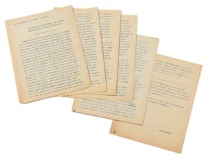 [OSCAR WILDE]. DOUGLAS Alfred Bruce (1870-1945) Écrivain et journaliste. Tapuscrit original «Une introduction à mes poèmes, avec quelques considérations sur l'affaire Oscar Wilde.» Publié dans La Revue Blanche [Paris] le 1 juin 1896. 9 pp in-folio. Quelques ratures à l'encre noire. A l'automne 1893, une rumeur commence à courir le tout-Londres : le poète Oscar Wilde, qui vient de triompher en avril dans sa comédie Une femme sans importance, aurait une liaison choquante avec un jeune aristocrate écossais. Cette rumeur va s'amplifier pendant un an et demi ; jusqu'à ce que le scandale éclate, en février 1895, alors que Wilde présentait au théâtre Saint-James sa nouvelle pièce L'Importance d'être sérieux. Dans la salle, un homme, brandissant une botte de navets (symbole d'une pièce fade), apostrophe violemment l'auteur, l'accusant de «poser au sodomite» avec son plus jeune fils, Alfred Douglas - qui avait déjà été renvoyé d'Oxford pour cause de «mauvaises mœurs».