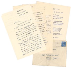 AURIC Georges (1899-1983) Compositeur du «Groupe des Six». 5 L.A.S. Correspondance à André Parinaud. Samedi 1953 & Hyères, 26 septembre 1953. 4 pp. in-8, dont accompagnée de son enveloppe timbrée. Belle correspondance du compositeur adressant au chroniqueur de la Parisienne, un article sur le fameux «groupe des six» dont il fut une des figures les plus actives. «Voici «l'article souvenir» demandé sur «les 6". Je sais très bien, à l'avance, qu'il est beaucoup trop long que celui que vous souhaitiez. Mais en le lisant, vous comprendrez comment j'ai dû lui donner cette fâcheuse proportion. Je suis tout le contraire d'un «auteur» ! Mais je me permets cette fois d'insister [...] Il me semble que la série de "dates" que je donne page 2, peut être réellement assez intéressante pour vos lecteurs. Impossible d'enlever deux lignes là-dessus [...]. Enfin, mon Dieu, mon début du style «mélancolique» que vous apprécierez ou n'apprécierez pas ! est peut-être un peu longuet [...]. Je compte sur votre amitié et votre attention. Publiez-moi sans coups de ciseaux intempestifs. Relisez gentiment mes épreuves [...]». Il demande en p.s. de mentionner dans la Revue des Arts, le vernissage des tableaux que sa femme expose «[...] Cette exposition est très remarquable (et ce n'est point un "mari" qui parle en ce moment!!)». - Hyères, septembre 1953. «[...] Je reçois aujourd'hui votre pneumatique me demandant pour Arts un article sur Madame Flagstad... et vous comprendrez aisément qu'il m'était assez difficile de vous envoyer cet article ce matin. Quant à la Parisienne et au "Paris Progress" du cher Strawinsky, le télégramme de François Michel m'a rejoint, lui aussi, beaucoup trop tard pour qu'il me soit permis d'être des vôtres, en ce mois de septembre où il était tellement exquis de flâner sur les plages catalanes [...]».