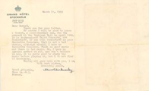 CHERKASSKY Shura (1909-1995). Pianiste d'origine russe. L.D.S. à Mt Sheldon. Nice, 31 mars 1959. 1 p. bifeuillet petit in-12 carré, en-tête en coins du Grand Hôtel de Stockholm, en anglais, enveloppe conservée. Le pianiste sera heureux d'adresser un autre billet pour le concert du 16 avril au Festival Hall. Il jouera Rachmaninov et non Prokofiev «[...] It is Rachamninoff Third Concerto, not Prokofieff. If you like Prokofieff as your favourite composer, that is not a bad choise, although myself, I have no favourite composer. There is good music and there is bas music [...]». Il indique encore qu'il n'a pas de méthode particulière, mais c'est mieux d'étudier une œuvre avant de la jouer.