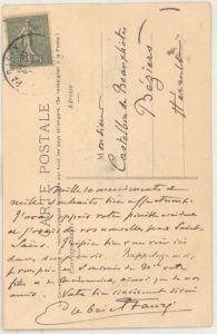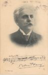 FAURÉ Gabriel (1845-1924) Compositeur. C.A.S. à M. Castelbon de Beauxhostes. Paris, s.d. (circa 1905). Sur carte postale avec portrait du compositeur et fac-similé d'une ligne musicale. Correspondance au mécène et amateur d'art de Béziers, le remerciant pour ses vœux, évoquant Saint-Saëns. Fauré ajoute : «[...]J'avais appris votre pénible accident et j'avais de vos nouvelles par Saint-Saëns. J'espère bien vous voir ici dans deux mois [...]». Il adresse ses souvenirs à la famille Caselbon et leurs amis.