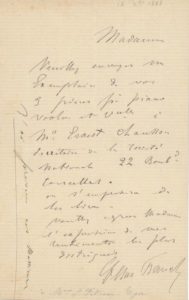 FRANCK César (1822-1890). L.A.S. à la pianiste Louise Filliaux-Tiger, (s.l.n.d. [Paris, 18 décembre 1888]. 1 p. in-8. Enveloppe jointe, marques postales. Elle lui demande «d'envoyer un exemplaire de vos 3 pièces pour piano violons et violoncelles à Mr Ernest Chausson [...]».