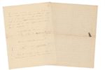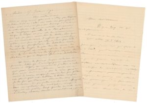 SAINT-SAËNS Camille (1835-1921). Pianiste, organiste, compositeur. 2 L.A.S. [à Meurice], Genève, 15 juillet 1892 et (s.l.n.d.). 5 pp. in-folio sur papier à carreaux. Le 15 juillet, il explique «vous m'avez avoué que vous n'étiez pas toujours en train d'écrire : cela me met un peu plus à l'aise avec vous ; un peu, pas beaucoup ! l'histoire de cette réponse infiniment retardée est presque aussi compliquée que celle de ce Triomphant Fanfan la Tulipe et j'ai cela de commun avec lui que je parais avoir tous les torts, alors que je suis innocent comme l'enfant qui vient de naître [...]», il poursuit en racontant son retour en France, il traverse Marseille, passe par Toulouse où il organise «deux grands concerts». Il évoque son bref passage à Paris, heureux d'être à Genève «enfin me voilà installé, tranquille, je vais pouvoir prendre Fanfan et le lire à mon aise. Horreur ! il est resté à Paris ! [...]» il poursuit sur la lecture de l'ouvrage et d'autres sujets... ; dans la lettre à Meurice, il s'interroge «“Il eut ce qu'on te donne cet autre roi d'Edone” parce que je ne sais qui était le Roi d'Edone que l'écriture même d'Edone m'est inconnu [...]» il craint que les spectateurs soient perdus et poursuit sur le morceau qui produira «l'effet que vous en attendez [...]»...