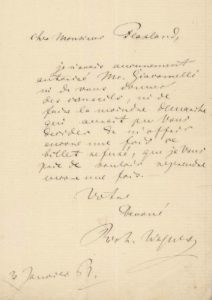 WAGNER Richard (1813-1883) L.A.S. à l'éditeur Gustave-Alexandre Faxland, (s.l.) 3 janvier 62. 1 p. in-8. Il indique sèchement «Je n'avais aucunement autorisé Mr. Giacomelli ni de vous donner des conseils, ni de faire la moindre démarche qui aurait pu vous décider de m'offrir encore une fois ce billet refusé [...]».