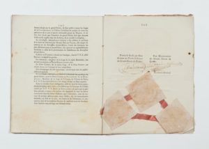 [FRANC-MAÇONNERIE]. Ensemble de 4 documents manuscrits du XIXe siècle. Formats divers. «Strophes détachées du chant des F:. M:.» ; «Écrit concernant le décret de la société des franc-maçons et les cérémonies qu'ils observent à la réception de ceux qui y sont admis». «Extrait des délibérations du souverain conseil du trente-troisième degré pour la France. Séance du 1er jour du 8° mois 5805.» Sceau des sublimes Princes du Royal Secret, 32° degré du REAA, début XIXe siècle gouache sur papier.