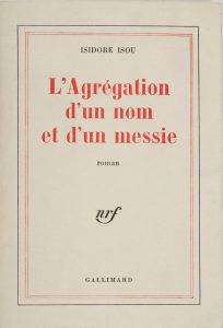 ISOU Isidore.L’agrégation d’un nom et d’un messie. Roman. Paris, Gallimard, 1947. Pt in-8, br.Édition originale, mention fictive d’édition. Bande annonce conservée.