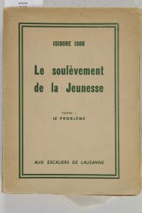 ISOU Isidore.Le soulèvement de la jeunesse. Tome I, le problème (seul paru). Aux escaliers de Lausanne, s.d. (1949). In-8, br. 342 pp. Édition originale. Rare.