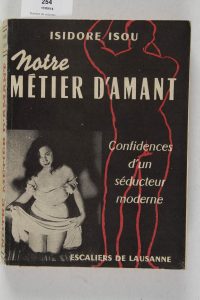 ISOU Isidore.Notre métier d’amant. Confidences d’un séducteur moderne. Aux escaliers de Lausanne, (1954). In-8, br. Couverture illustrée. Ed. originale. Premier roman « léger » d’Isou.