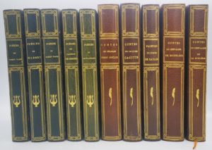 Collection des Petits conteurs du XVIIIe s. Paris, Quantin, 1878-1883. 12 vol. — Collection des Petits Poètes du XVIIIe s. Paris, Quantin, 1879-1886. 12 vol. — Ens. 24 vol. in-8, demi-maroquin brun et demi- maroquin bleu à coins, dos lisses ornés d'une plume, têtes dorées, non rognés, couv. et dos cons. (Rel. exécutée pour la librairie Louis Conard). Charmante collection "tirée à petit nombre", sur vergé de Hollande, et illustrée de gravures hors-texte, certains frontispices en triple état, et fac- similés. - Conteurs : Crébillon, Rétif, Moncrif, Voisenon, Fromaget, Besenval, d'Aucourt, Pinot Duclos, Cazotte, Caylus, Boufflers, La Morlière. Des rousseurs, couv. salies. - Poètes : Bernis, Gilbert, Piron, Lattaignant, Boufflers, Vadé, Bonnard, Gentil-Bernard, Malfilâtre, Desforges-Maillard, Bertin. Ex-libris Bibliothèque Paul de Saint Victor. Charnières fendues. Des rousseurs, couv. salies. Dos passés.