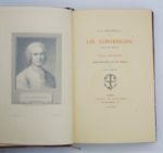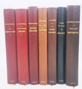 Collection Jouaust. Paris, Librairie des Bibliophiles Jouaust. Réunion de 30 vol. in-8, bradel demi-maroquin rouge, bordeaux, violine, vert, bleu ou brun à coins, tête dorée (Rel. du début XXe). Tirages sur grand papier limité (de 175 à 220 exemplaires). Chaque série est un des 170 (ou 125) ex. sur hollande. - ROUSSEAU. Les Confessions. 1881. 4 vol. — La Nouvelle Héloïse. 1889. 6 vol. - MONTESQUIEU. Lettres persanes. 1886. 2 vol. - GOLDSMTIH. Le Vicaire de Wakefield. 1888. 2 vol. - CAZOTTE. Le Diable amoureux. 1883. 1 vol. - LESAGE. Gil Blas de Santillane. 1879. 4 vol. — LESAGE. Le Diable boiteux. 1881. 2 vol. - PRÉVOST. Manon Lescaut. 1874. 2 vol. — STERNE. Voyage sentimental. 1875. 1 vol. — Premier [à Quatrième] voyage de Gulliver. 1875. 4 vol. — HOFFMANN. Contes fantastiques. 1883. 2 vol. Frottements et certains dos passés.