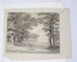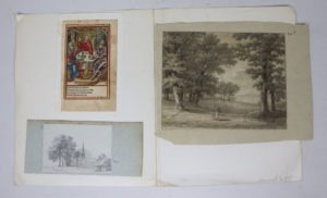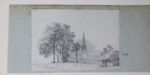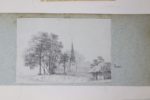 Dessins originaux au crayon : Paysage, avec esquisses de personnages. H_21 L_16,5 cm. Paysage, avec vue sur un clocher. H_env. 12 cm L_8 cm Jointe : petite gravure sur bois coloriée, XVIe s. Les Pèlerins d'Emmaüs, verset en français.