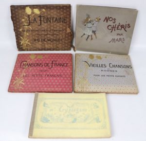 ENFANTINA. — Ens. de 5 ouvrages : BOUTET DE MONVEL. Chansons de France. Paris, E. Plon, Nourrit et Cie, sd. In-8 oblong, toile rose illustrée de l'éditeur. Rousseurs. Cartonnage passé, frotté, lien manquant. BOUTET DE MONVEL. Vieilles chansons et rondes pour les petits enfants. Paris, E. Plon, Nourrit et Cie, sd. In-8 oblong, toile bleue illustrée de l'éditeur. Rousseurs. Cartonnage passé, frotté, lien manquant. BOUTET DE MONVEL. La Fontaine. Paris, E. Plon, Nourrit et Cie, sd. In-8 oblong, toile brune illustrée de l'éditeur très usagée, avec manque au dos. Rousseurs. MARS. Nos chéris. Paris, E. Plon, Nourrit et Cie, sd. In-8 oblong, percaline illustrée de l'éditeur. Manque une garde. Quelques rousseurs, petites déchirures sans manques. Cartonnage très usagé, manques au dos. TOPFFER]. Histoire de M. Cryptogame. 5e édition. Paris, Imprimerie J. Claye, s.d. (1861). In-8 oblong, broché, titre et 64 ff. de vélin fort illustrés en noir, couv. illustrée. Rousseurs. Dos refait.