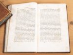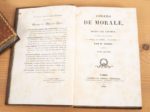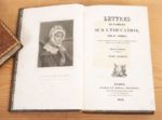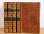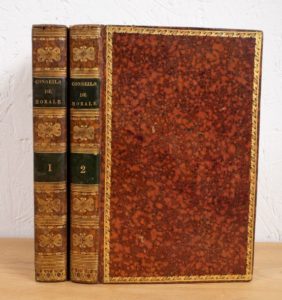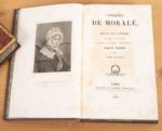GUIZOT (Mme). Lettres de famille sur l'éducation. Deuxième édition. Paris, Pichon et Didier, 1828(-1826). 2 vol. Conseils de morale ou Essai sur l'homme, les moeurs, les caractères.... Paris, Pichon et Didier, 1828. 2 vol. Ens. 4 vol. in-8, veau porphyre, roulette dorée en encadrement, dos lisse orné, pièces vertes, tranches marbrées (Rel. époque). Portraits-frontispices. Rousseurs. Éducation, tome II : édition originale. Morale, tome I, trous de vers sur les plats. Plaisant ensemble.
