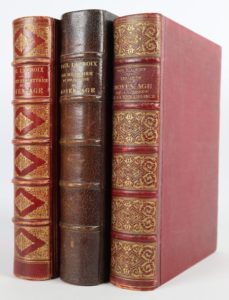 LACROIX (Paul). Sciences et lettres au Moyen-Age. Paris Firmin-Didot, 1877. In-4, maroquin rouge, triple filet, dos à nerfs orné, dentelle int., tr. dorées (Adolphe Bertrant). 13 chromolithographies et nbses gravures in-t. Rel. frottée, petite fente à 2 mors. Joints du même auteur : -Vie militaire et religieuse au Moyen-Age. Paris, Firmin-Didot, 1877. In-4, demi-maroquin bordeaux à coins, dos à nerfs, tête dorée. Quatrième édition. 14 chromolithographies et nbses gravures in-t. Dos lég. passé. -Les Arts au Moyen-Age. Paris, Firmin-Didot, 1880. In-4, demi-chagrin rouge, dos à nerfs orné, tr. dorées. Septième édition. 20 chromolithographies et nbses gravures in-t. Rousseurs.