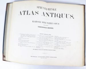 SPRUNER-MENKE. Atlas antiquus. Justi Perthes, Gothae, 1865. In-folio, demi-cuir de Russie fauve à coins (Rel. de l'époque). Intéressant atlas contenant 31 cartes du monde antique, aux contours coloriés, de l'Europe, bassin méditerranéen jusqu'au Moyen Orient et Inde. Reliure très usagée, avec restaurations. Rousseurs et mouillures sur les ff. de descriptions et in fine. Cartes propres.