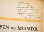CENDRARS (Blaise). La Fin du monde filmée par l'Ange N.-D. Roman. Paris, La Sirène, 1919. In-4, broché. Édition originale, ill. de compositions en couleurs de Fernand Léger. Ex. sur vélin Lafuma non numéroté, enrichi de cet envoi a. s. de l'auteur : "à Madame Germaine Dulac, ce premier essai d'un scenario, alors que je n'avais encore jamais vu un appareil de prise de vue, très respectueusement. Blaise Cendrars, Nice, juin 1920". La réalisatrice Germaine Dulac (1882-1942) avait tourné son premier film dès 1915 (Les Soeurs ennemies) ; elle était au coeur de l'avant-garde des années 1920, et l'on sait que Cendrars fut sensible à cette nouveauté artistique. Ex-libris M.-A. Colson. Brochage taché, frotté. Ex. manipulé, taches et rousseurs, marquées sur le faux-titre.