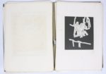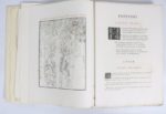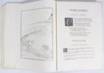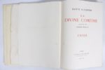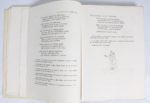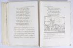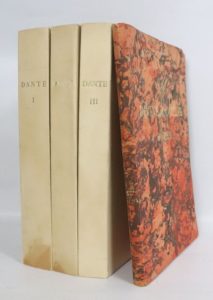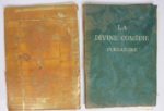 DANTE. La Divine comédie. Paris, Jacques Beltrand, 1922. 3 vol. in-folio, en feuilles, chemises ivoire, traces de liens. Édition publiée à l'occasion du sixième centenaire de la mort de Dante, illustrée d'environ 180 dessins dans le texte d'après Sandro Botticelli, gravés sur bois en camaïeu par Georges Camille et Jacques Beltrand. Le texte italien est placé au-dessus de la traduction française d'André Pératé.  Tirage à 225 exemplaires, n° 57. Jointes 3 suites en feuilles, sous chemises de papiers marbrés (usagées, avec petits manques) : Enfer : 88 pl. en noir et en bistre dont des décompositions. Purgatoire : 64 pl. en noir. Paradis : 40 pl. en noir. Rousseurs, marges empoussiérées, roussies. Chemises tachées, liens manquants.