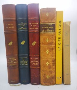 Lot d'ouvrages divers. - BOSIS (Lauro de). Icare. 1933. Tirage à 1000 ex. Couv. insolée. - BOUTON. Nouveau traité des Armoiries. Paris, Dentu, 1887. Dos et premier plat détachés. - Vie publique et privée des anciens grecs. Classes, métiers, trafic. — Institutions militaires. — Histoire du costume. L'Orient. Paris, Les Belles lettres, 1931-1935. 3 vol. in-4, demi-mar., dos passés, frottés. - MAUREL (Jean-Pierre). La Cité antique. Texte et poèmes. Paris, chez l'artiste, 1976. In-8, en feuilles, chemise toile jaune. 9 sérigraphies originales à la gouache de Robert Viel. Tirage à 75 ex. Vendu en l'état.