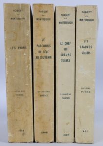 MONTESQUIOU-FEZENSAC (Robert de).Les Chauves-souris. - Le Chef des odeurs suaves. - Le Parcours du rêve au souvenir. - Les Paons. Paris, Georges Richard, 1907-1908. 4 vol. in-8, brochés, non coupés. Édition définitive des poèmes II à V, sur VII, avec portrait de l'auteur. Couv. empoussiérées.