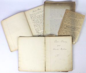 AUTOGRAPHES. — RÉDAN (André). Porte-Plumes. Silhouettes sans retouches. 2 cahiers in-8, demi-percaline bleue, bandeau orange sur le premier plat du second volume indiquant le titre et le numéro du tome, dos lisse. Écrit sur le recto seulement. Ouvrages manuscrit très lisibles. Ensemble de résumés humoristiques et souvent grinçants, de 68 figures littéraires célèbres dont Anatole France, Guillaume Apollinaire, Pierre Loti, Max Jacob… « Rémy de Gourmont pensait s'asseoir à l'Académie Goncourt et déjà fait choix d'un coussin, mais une dame retira la chaise ». Sur Max Jacob « sémite subtil, ourlé de crasse, vaporisé d'éther et brodé de lyrismes »… Ouvrage enrichi : de 2 lettres autographes signées de Léon Bloy, à André Dupont, homme de lettres, tombés au champ d'honneur en 1916 - et de 28 feuillets in-4, dactylographiés, reprenant certaines notices. Cahiers usagés, certains feuillets débrochés. Table des noms cités en fin de cahier.