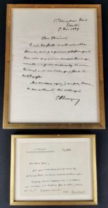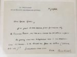 CLÉMENCEAU (Georges). Lettre a. s., datée de Saint Vincent sur Jard, Vendée, 5 (?) juin 1929, une page in-4, pliée, sous cadre. Il remercie une personne pour sa demande mais il ne pourra la satisfaire. On joint : BENOIT (Pierre). Billet a. s. daté 15 juillet, sur papier à en- tête du Président de la Société des gens de lettres, adressée à sa "chère Marie Anne".